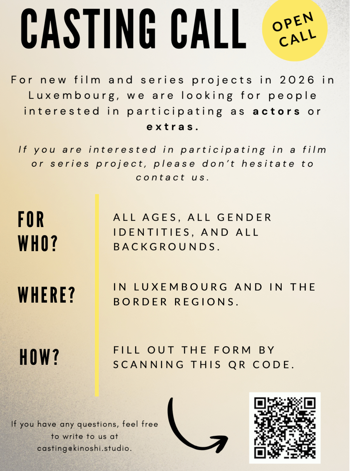 Les personnes intéressées peuvent remplir notre formulaire via le QR code sur le flyer, répondre à quelques questions et nous envoyer leurs photos. Petite précision : certains peuvent rencontrer des difficultés pour télécharger leurs photos via le formulaire. Dans ce cas, elles peuvent nous être envoyées directement par email à casting@kinoshi.studio, et nous les intégrerons dans notre base de données. Bien entendu, si vous êtes comédien ou comédienne pro, n’hésitez pas à nous transmettre vos photos, bande démo, CV, etc. Nous serions ravis de collaborer avec vous sur de futurs projets. Je vous remercie beaucoup pour votre aide et vous souhaite une excellente journée. Cordialement, Morgane Verdin-Pol |